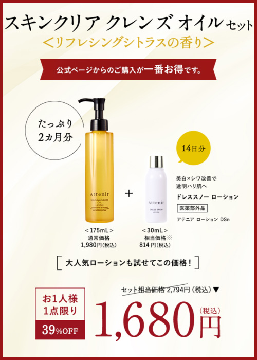 - 公式サイト限定でクレンジング本品と医薬部外品の美白※3・シワ改善化粧水(販売名:アテニア ローション DSn)14日分がセットでお試しできる